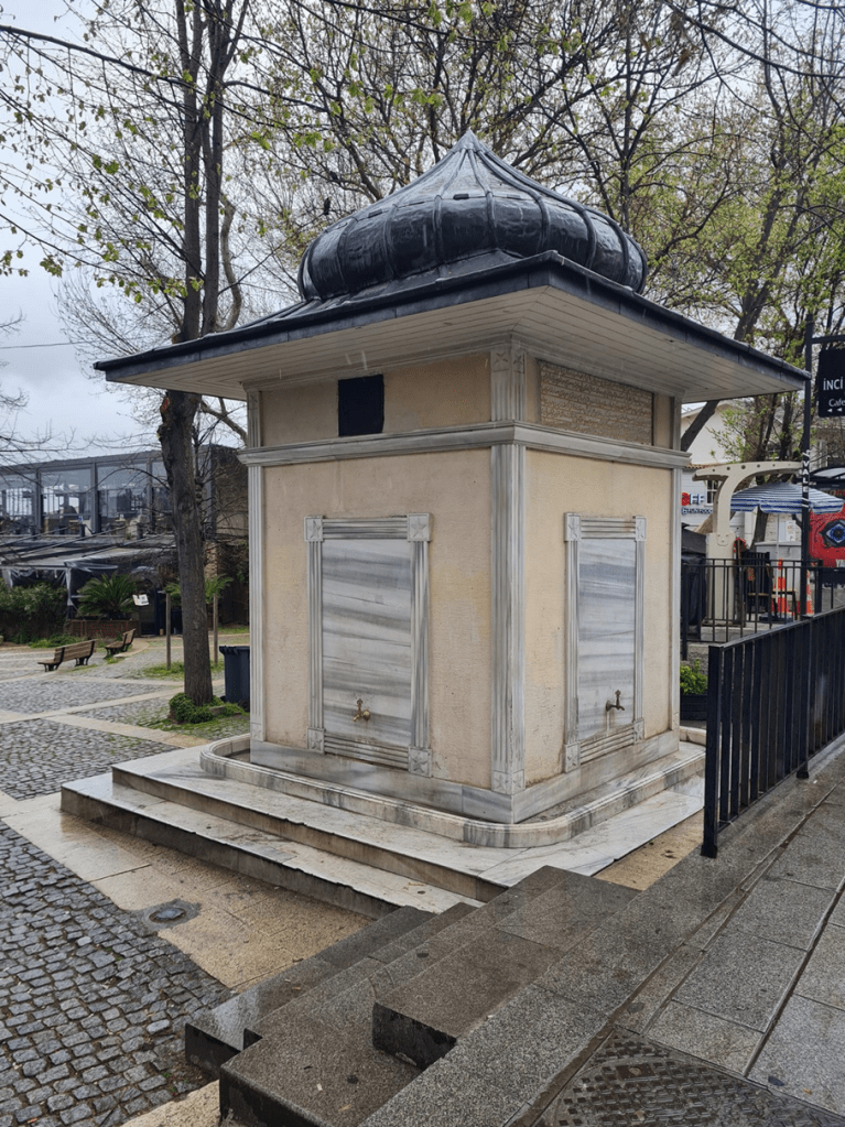 Evet biraz ağdalı ve anlaması zor bir kitabe ama mutmain bir saraylının Yunus Emre gibi sade bir dille yazması beklenemez elbette. Benim estetik bulduğum bir çeşme. Bir de üzerinde muhtelif sokak tabelaları olmasa, yalağı toprak altında kalmasa ve musluğundan su aksa daha iyi olur ama…