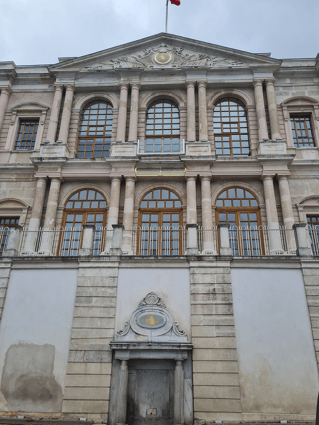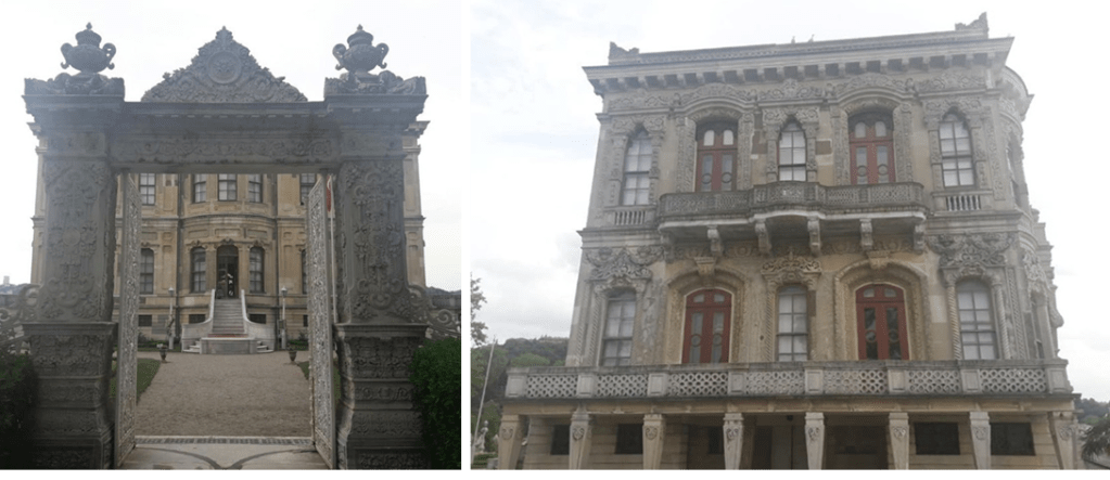 Kara tarafından giriş kapısı bir hayli şatafatlı. Ön tarafta Saltanat kayıkları için deniz girişinin yanı sıra iki sıralı merdivenlerin ortasına yerleştirilmiş bir süs havuzu var. Restorasyona denk geldiğim için uygun fotoğraf almakta çok zorlandım. İçeriden gelen balyoz sesleri daha önce hiçbir restorasyon çalışmasında duymadığım türden. Hayırlısı.