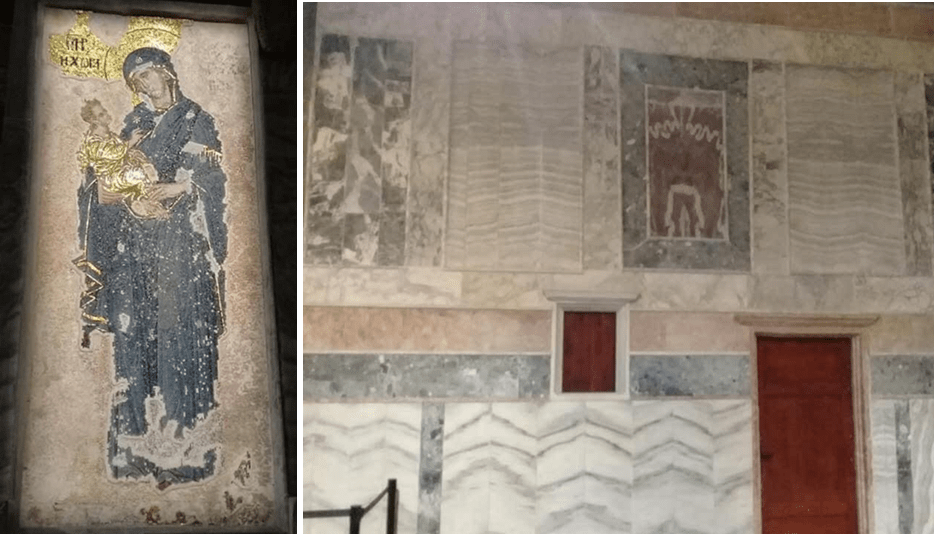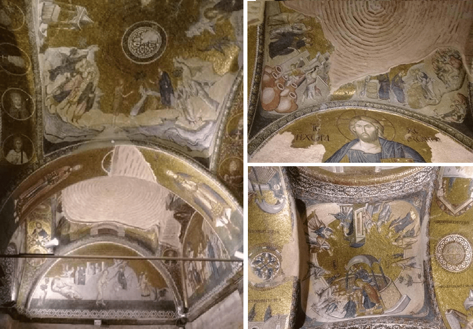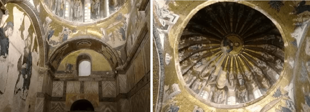 İki kubbeli dış koridora girdiğinizde mozaikler göz kamaştırıyor. En büyük mozaik pano İsa ve Meryem ile ona kiliseyi sunan kilisenin imparator olan ilk banisi. Kubbelerin yüksek olanında madalyon İsa. Diğerinde ise Meryem. Her ikisinin etrafında ise ataları var ki bunların çoğu tüm semavi dinlerde kabul görmüş peygamberler.