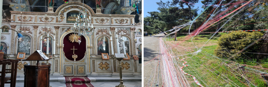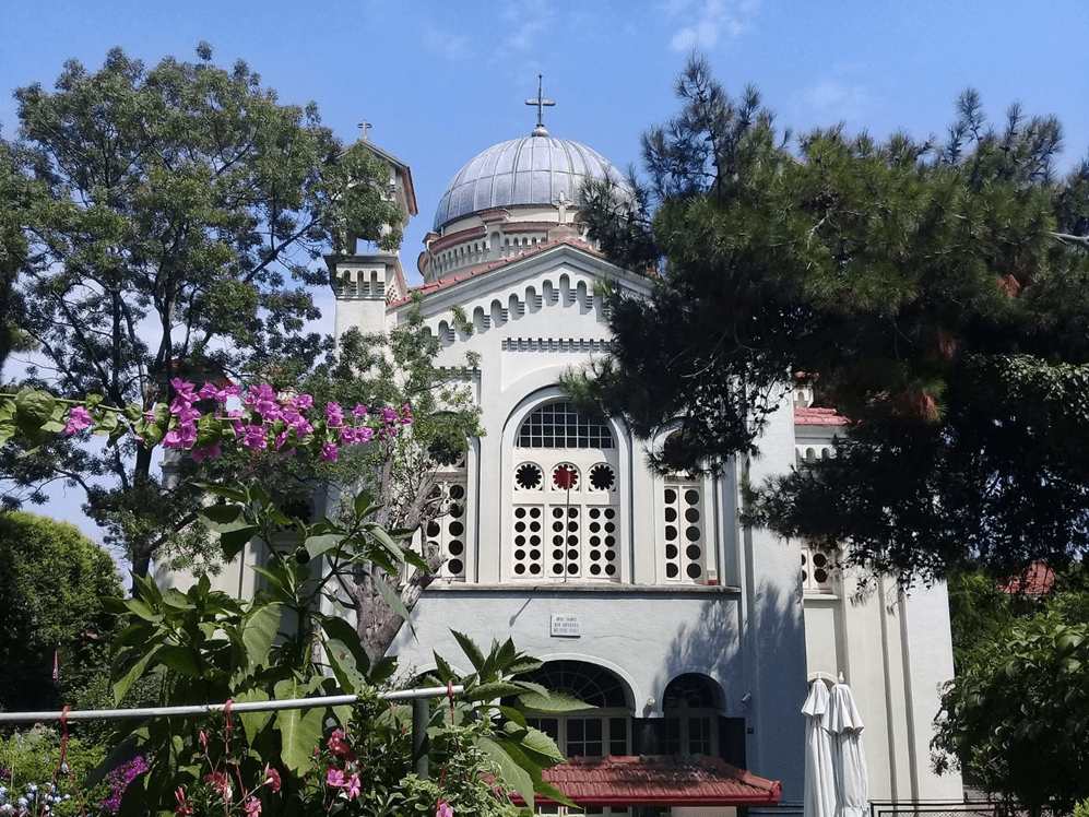 Ada gezisine üç rahmani dinin ibadet yerleri ile başlayacağım. Gemiden iner inmez karşınıza adanın ana meydanına egemen olan bu kilise çıkıyor. Kilise, neredeyse tüm erkeklerin denizci ya da balıkçı oldukları bir adaya uygun olarak, denizcilerin koruyucu azizi olan Aziz Nikola’ya adanmış bir Bizans kilisesinin yıkıntıları üzerine 1857 yılında kurulmuş. Merkezi kaplayan yüksek bir silindirin tepesine örtülmüş kubbesi, dört destek payandası, dört kolunun üstündeki beşik kemerleri ve ana yapıdan bağımsız olarak yükselen çan kulesi (ki aynı zamanda saat kulesi görevi görüyor) ile plan açısından haç şeklinde. Narteks’in önündeki ayrı bir yapı ise Aziz Paraskevi’nin kutsal çeşmesine ev sahipliği yapıyor.