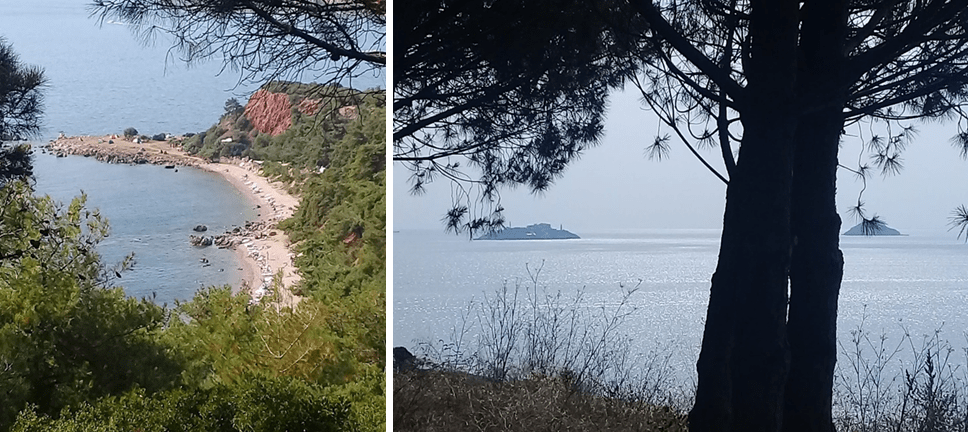 Terki Dünyayı terk edip çam limanı koyunu dolanıyorum. Önce deniz seviyesine inip daha sonra tekrar tırmanmak biraz yoruyor açıkçası. Bu bölgede gölge yapan ağaçlar da yok yol kenarında. Neyseki tam yokuşun sonunda esintili bir kafe var.