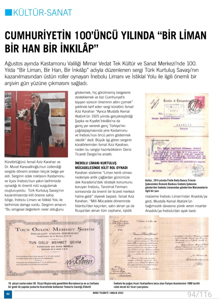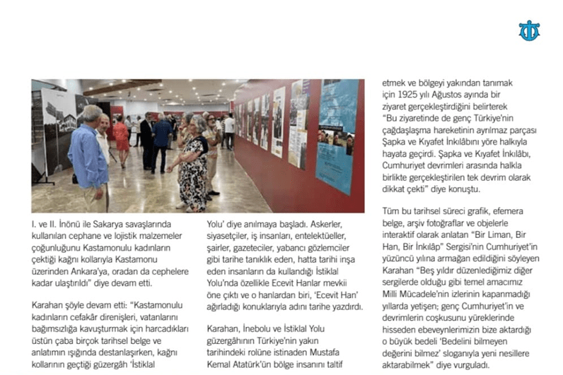 Bu sergide ayrıca Cumhuriyet döneminden başlayarak bazı şapkaları da sergiledik. Bu sergi ile ilgili Deniz Ticareti Dergisinde şöyle bir yazı çıktı. 1 Eylül’e kadar açık olan sergide Cumhuriyetin 100. Yılında İstanbul’da oturanların dikkatini İnebolu ve Kastamonu’ya çevirmelerini sağladık.
