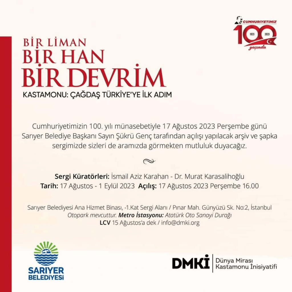 Cumhuriyetin 100. yılında sergi faaliyetlerimiz oldukça hızlandı diyebilirim. Önce 17 ağustos tarihinde DMKİ (Dünya Mirası Kastamonu İnisiyatifi ) ‘nin katkıları ile 2022 GGG sergisini genişleterek yine Sn Murat Karasalihoğlu ile birlikte küratörlüğünü yaptığımız “Bir Liman, Bir Han, Bir İnkılap” isimli bir sergiyi Sarıyer Belediye binasında açtık.