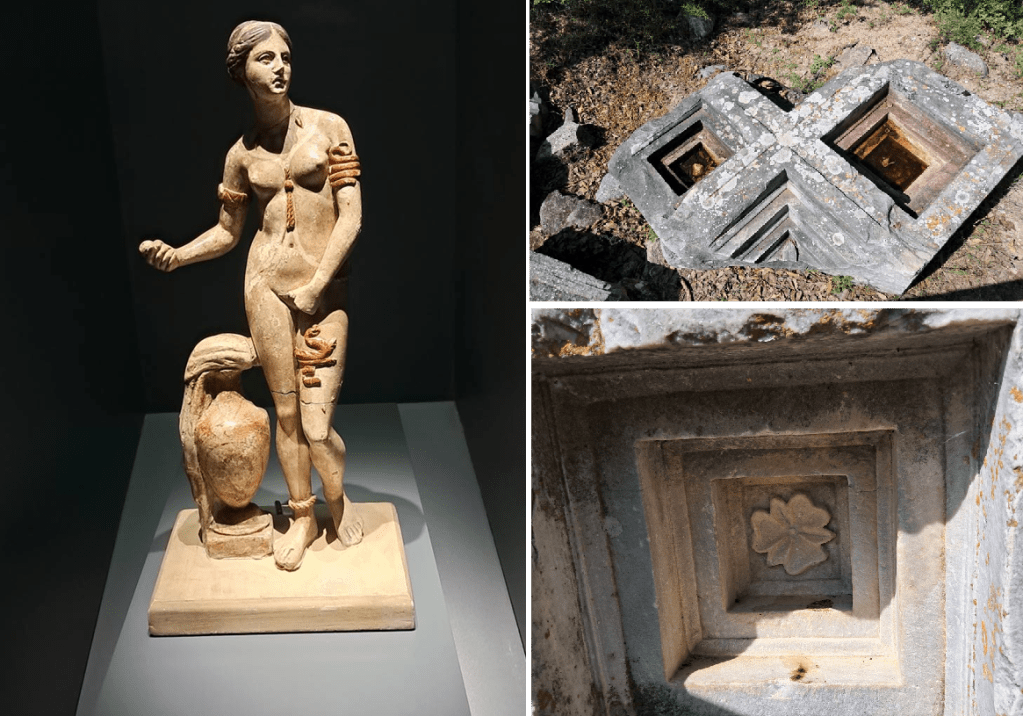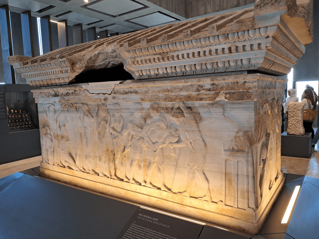 Troya krallarindan birinin kızı olan Poyksena’nın kurban edilişini tasfir eden bu kabartma nedeniyle onun adıyla anılan bu lahitin içinden 40 yaşlarında olduğu tahmin edilen bir erkek ceseti çıkmış. Tahminim o ki olsa olsa lahti kırıp içine giren definecinin arkadaşının keleğidir.