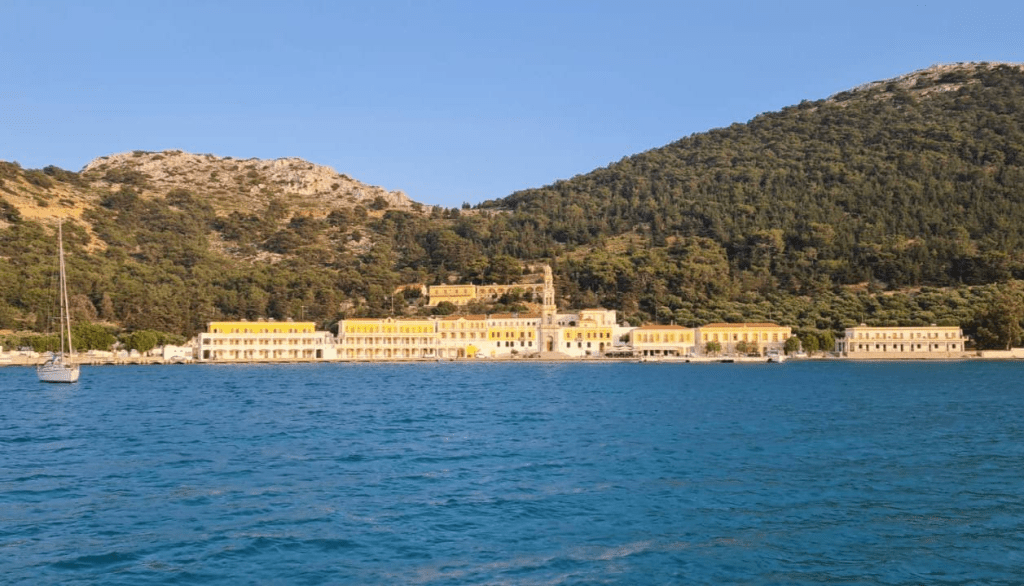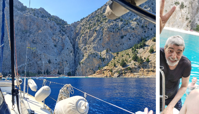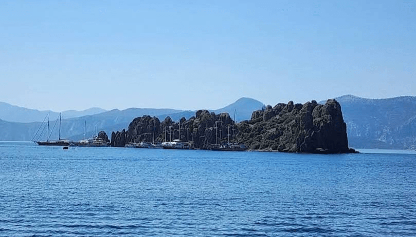 Daha sonra Symi’nin güneyindeki Osmanlının Harami Ada dedigi Seskli adacığını geçip Manoramitis Manastırının bulundugu koya gidip geceyi alargada geçirmeyi planladık. Seskli ile adanın arasından geçerken hava ve deniz durumu bizi kaygılandırdı ama koyda manastıra karşı yemek bizi keyiflendirdi.