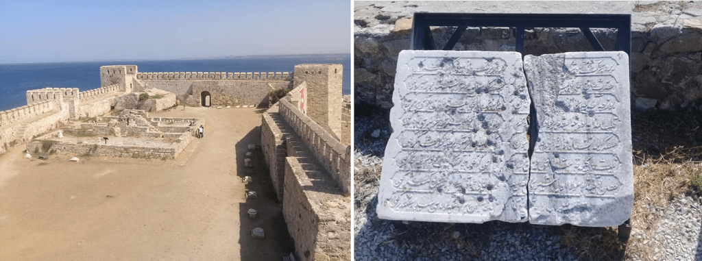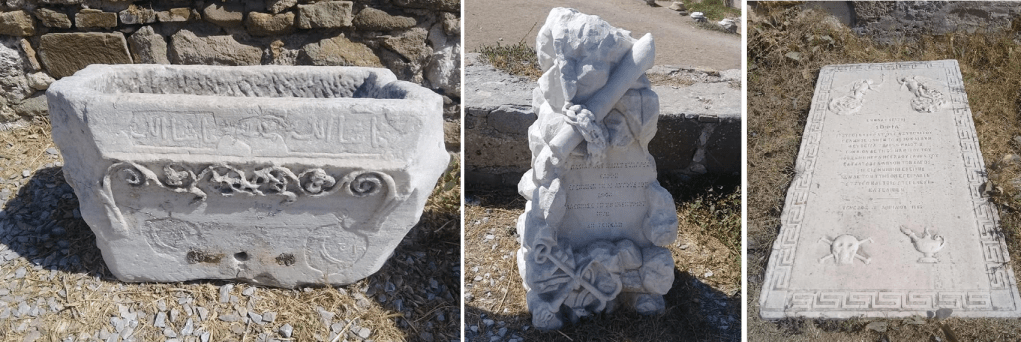 Son olarak sırasıyla eski bir mezarlıkta bulunan suluk, değişik bir yunan mezar taşı ve mezar üstü mermer bir plaka fotoğraflarını çekip kaleden çıkalım.