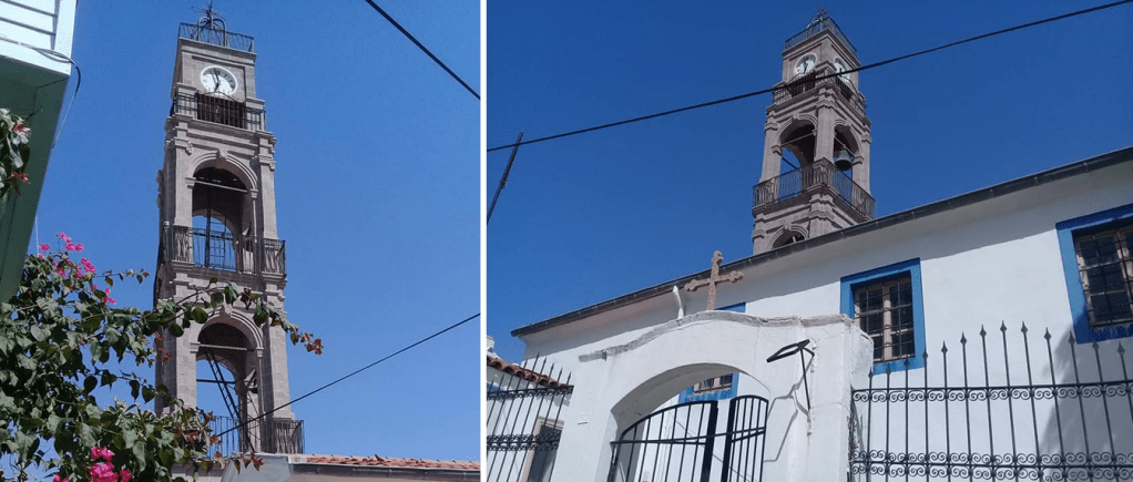 Meryem Ana Kilisesi avlusundaki 4 katlı saat kulesi ve üzerindeki çanı ile Bozcaada’nın sembolik yapılarından biri.