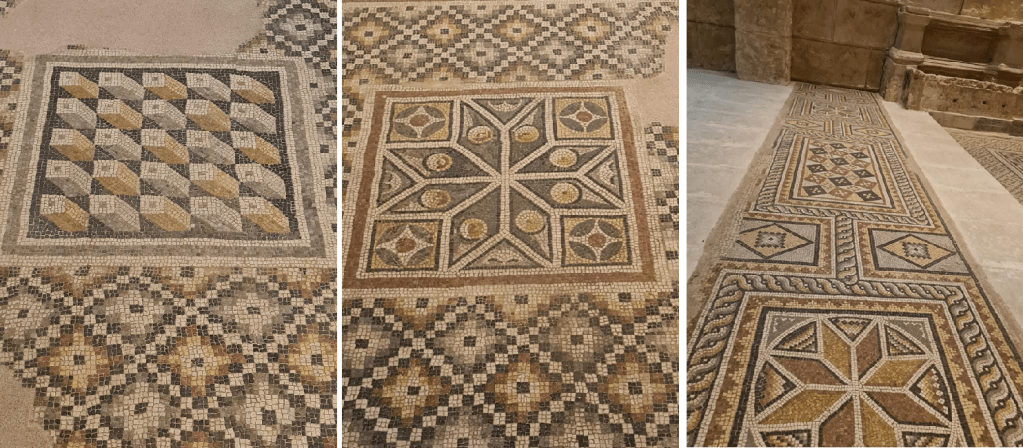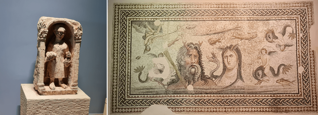 Soldaki mozaiğin adı “Okeanos ve Tethys” Bir villanın havuzunun tabanında bulunmuş. MS 2-3. yüzyıla tarihleniyor. Ortada hayat kaynağı olan Irmak tanrısı, Okedeon ve karısı Tethys, etraflarında denizin verimliliğini anlatan muhtelif balıklar ve yunuslar üzerinde Eroslar görülüyor. Üçlü örgü ile çerçevelenmiş.