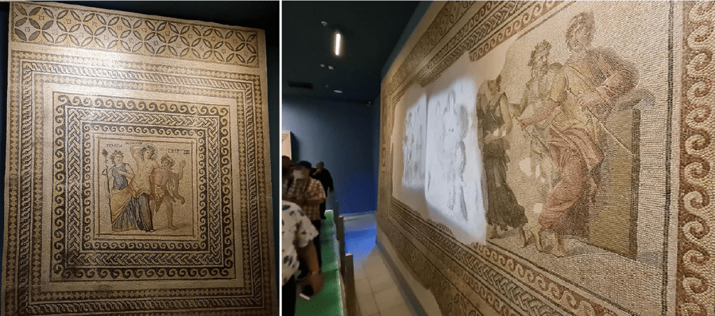 Sağdaki mozaiğin adı “Dionysos ve Ariadne’nin düğünü” Dünyanın en özel mozaiklerinden biri. Mozaik kullanılan renk zenginliği ve ışık-gölge oyunları ile bir tablo etkisi yaratılmaya çalışılmış. Çok fazla figür olması ve figürlerin resim kalitesinin yüksek olması onu değerli kılıyor.